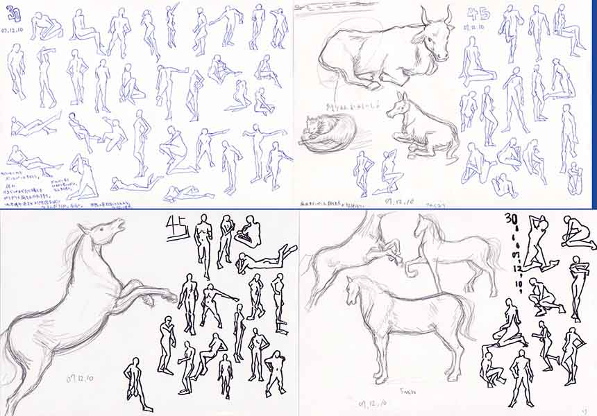 主に動物や人体など動きのあるものを素早く捉える訓練として行われる。またタブロー(完成作品)へ昇華させるための習作として行われる場合もある。